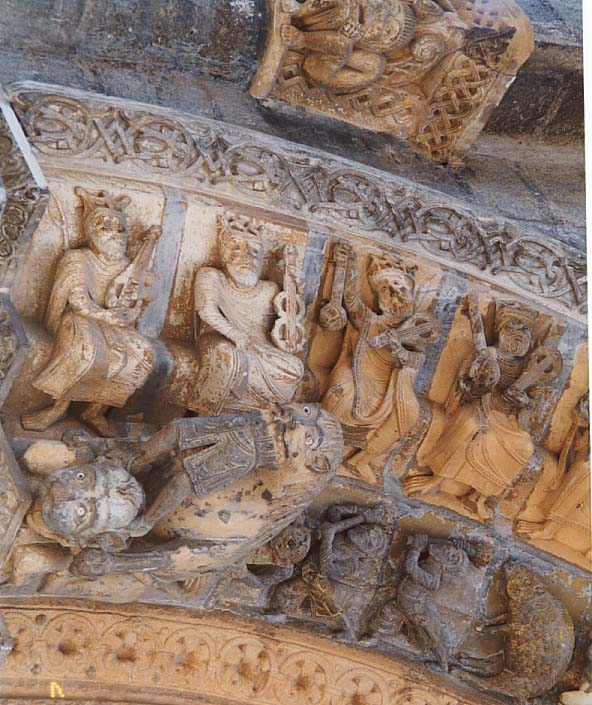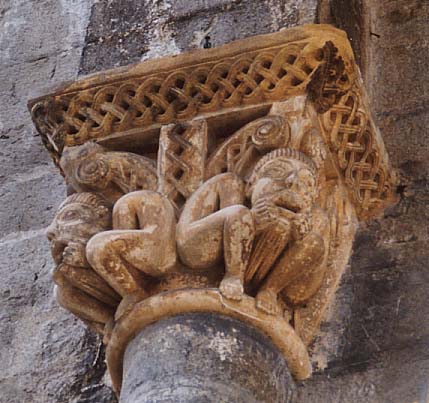 | 来る途中に「11世紀の教会」という看板があったことを思いだし、暇つぶしに行ってみることにしました。公園の中に建つロマネスク様式の教会は外側の装飾が美しい。内部はガイド付きツアーありとのことですが、それは4月から10月の間だけで、今は閉まっていました。この教会は、何処を見ても「教会」と書いてあるだけで、名無しのゴンベー。サンチャゴ・デ・コンポステラ巡礼路上らしいロマネスク教会だけれど、Daxのガイドに書いてある4世紀のSainte-Marie-Cathedralとは違うものらしい。