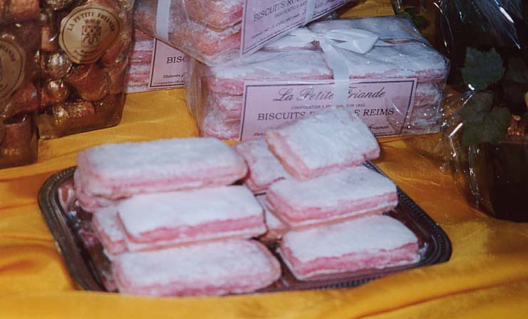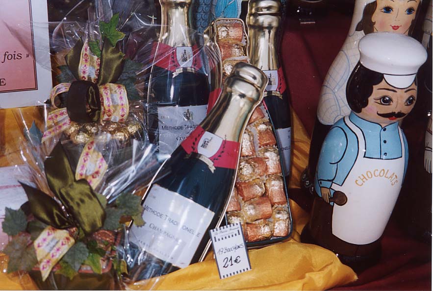 ランス名物として紹介されていたのはサクサクしたピンクのお菓子。とても綺麗でおいしかったので沢山買いましたが、紙の箱しか無く、粉が出て、持ち帰るのが大変でした。このお菓子を作るには、小麦粉ではなくピンクの粉を使うのだそうですが、ピンクの色は何処から来るのか、訊いてみましたが確たる返事はありませんでした。 ランスはまたシャンパンの中心地ですから、シャンパンに因んだお菓子も沢山有り、右の写真のものは、シャンパンの栓の形に作られたチョコが、ビンの形をした容器に納められているものです。 |