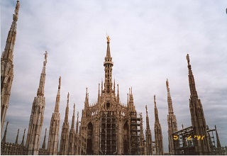 ドゥオモ大聖堂屋上にて 金色のマリア像(中央先端)を望む |
