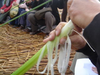 行程中、沢山の検問所を通過して、ようやくプーノ着。ホテル着後すぐにボートでチチカカ湖の浮島群ウロス島へ向かう。直前に雨が降ったらしく、葦を敷き詰めた足元は湿っていて寒いが、子供達は裸足。フジモリ政権になってやっと電気、学校、病院が出来たそうだが、悲惨で正視に堪えない。目の前にある私達の宿は、いくら物価が安いとはいえ、日本では私達も泊まれないような豪華な5つ星、この子達の目に私たちはどう映るのだろう。