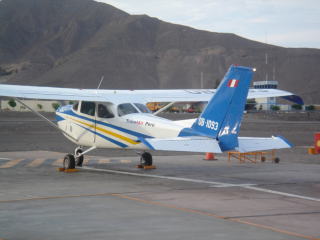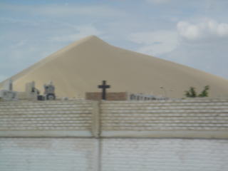 WC休憩の前にイカの町へ。ペルーへ移住した日本人も多数住むというこの町を少し見物ということで、バスのまま町の中央部へ。東南アジアを思わせるゴミゴミした町の雰囲気、ここへ来た日本人移住者の心を思いやると切ない。遠くに名物の砂山=黄色を見ながらイカ空港のWCへ。ここからも地上絵ツアーの飛行機が出る。