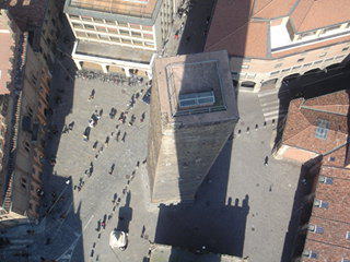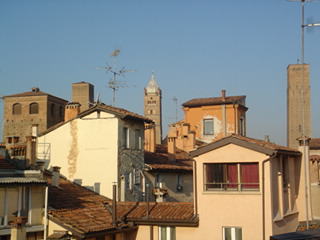 朝食が終わってベランダに出てみると・・・。なるほど、町の真ん中なのでボローニャのシンボル、二本の塔が目の前。その塔の周りはまさに古いイタリアの景色そのまま。並んで立っている二本の塔は、一方が傾いている。