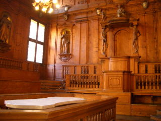 天井まで木造の中にポツンと解剖台がある。壁には医学に貢献した偉人達の彫刻、正面の像は「皮を剥かれている」そうな。