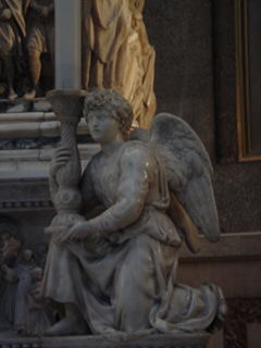 「地球の歩き方」には載っていないが、ここボローニャにはミケランジェロの彫刻があると聞いて観光案内所で問い合わせ、サン・ドメニコ教会へ。載っている本を持って来なかったので、ミケランジェロの作品がどれだか判らず、お祈りをしながら歩いていた坊さんに声を掛け案内していただく。 |