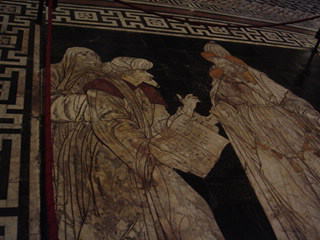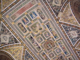 シエナにはカトリーヌの生家もあるがパスして、大聖堂へ。トスカナ特産の白と黒の大理石で作られた素晴らしい大聖堂の正面はしかし残念、工事のためシートに覆われている。その代わりか、いつもは大部分がシートで覆われている内部の床が今日は公開されている。フィレンツェに対抗していた金持ち都市シエナは、その富を誇示すべく大聖堂の床を大理石の象嵌絵で埋めており、その絵の覆いが完全に取られるのは一年に一度、8月15日から9月15日だけということなので、まあある意味今日はラッキーか。 |