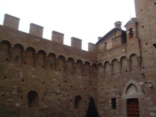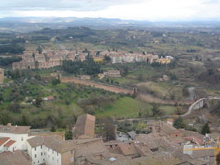 出発すると30分ほどで右側に小高い山、アッ、モンテリッジョーニだ。何年か前にフィレンツェ近辺だけを旅した時、ゲーテが「トスカナの王冠」と形容した場所ということで行ってみたら、町のこちら側から向こう側の出口が見えてしまうほどの小さな集落で驚いたものだ。「王冠」と称されるように集落を囲む市壁が王冠のようにデコボコしている。中には有名なレストランもあるのだが、多分それも団体などは受け付けられないほど小さいのだろう。先年は観光が短時間で終わってしまったために、バスの運転手に頼んで近くの見所へ案内してもらった。山の麓にはブルグンド族の女王が建てたという古い教会があり、現在は有名なレストランになっている。若い日本人の見習いが二人もいたっけ。その後は再びバスに乗ってエルザの谷という所ヘ行き、豪快な崖の上に立つ由緒ある町を訪れたのも良い思い出、思いがけないおいしいレストランがあった。 |