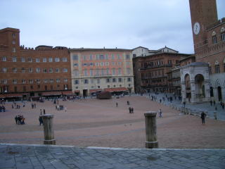 カンポ広場は開いた扇の形をしており、中央にある市庁舎の方へゆるく低く傾斜している。パリオの当日には広場に砂が蒔かれ、様々な旗を持った人がパレードした後には競馬場に変わる。広場を囲む建物のバルコニーで大勢の人が観戦する様子は中世さながら、一度は体験したい別世界だ。