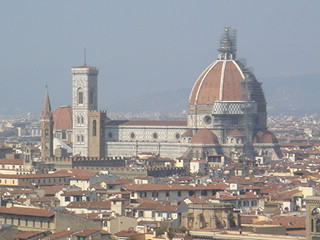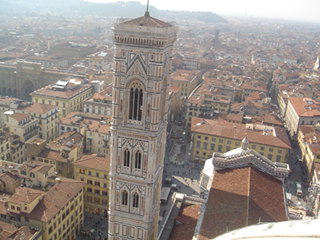 また街中へ戻って今度は花の大聖堂へ。塔を見れば登る私たちは早速ドーム入り口へ。登るのは大変だがドームの内部やステンドグラスが真近で見えたり、教会内の人々が信じられないほど小さく見えたりで楽しい。登りきったドームの外側は展望台になっており、フィレンツェの観光名所が一望に見える。 |