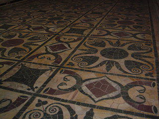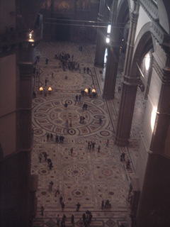 教会内部に降りて一休みの後は、地下へ。イタリアの建物の殆どは地下にあるローマ時代の遺跡の上に建てられたもの、この教会も下に行くと美しいモザイクのある古代の建造物の跡が見られる。天井が低いが土産物屋もあり大繁盛。