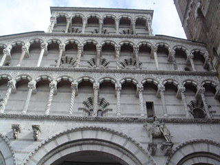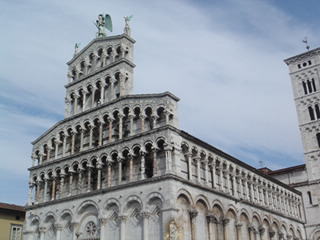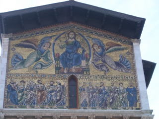 次は町の更に奥のサン・フレディアーノ教会。建物の前面がモザイクで出来ている。何年か前に来た時にはモザイクの右下が破損して悲惨な様子だったが、修理されたようだ。売っている絵葉書は破損したままなのが少々笑えるが。 |