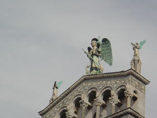地図を頼りに迷路のような道を町の中心部にある聖ミケーレ教会へ。さっきの大聖堂もそうだが、ここの教会は上部が衝立のように教会の建物自体からせり出す独特の形をしている。こちらは最上部に聖ミカエルの像が立っており、かなり異様。古くて苔むしている感じ。