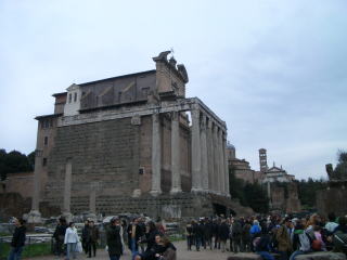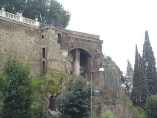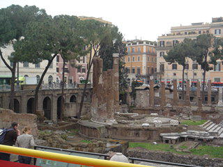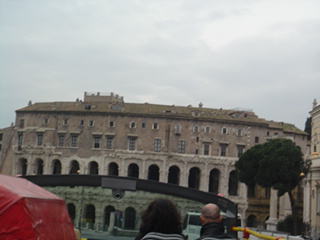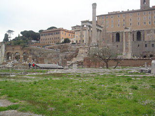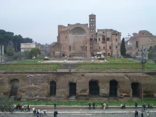下に降り、昔の道を辿りながら昔の建物群を見学。シーザーの墓だの元老院などを見るが、どこも人が一杯。フォロ・ロマーノの最後の部分、高台の上の建物は、ローマ時代のものに継ぎ足して現在は市庁舎として使っている。