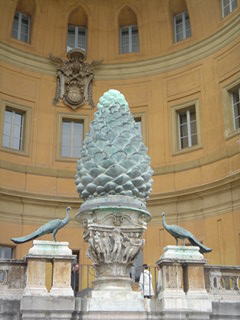 さて美術館を見学。ストロボを使わなければ写真撮影も可らしいが、暗くてうまく写らない。大きな松ぼっくりのある広場で一休み。