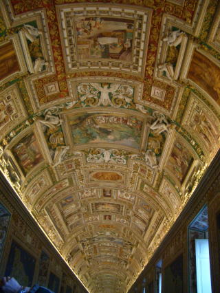 次は古い地図の並んでいる回廊、天井もなかなかのものだ。美術館の中は床もモザイク。巨大な絵画、天井画などを通り、ようやくシスティナ礼拝堂へ辿り着く。