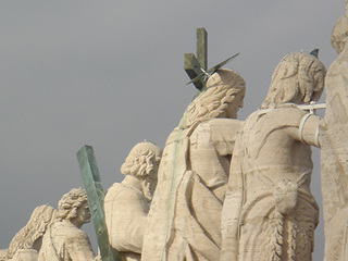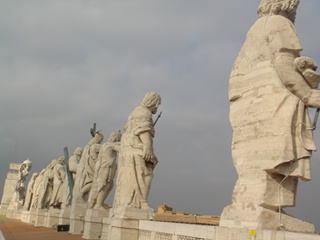 再びエスカレーターの階まで降りて、広場に面して立つと沢山の大きな聖人像が見える。 |