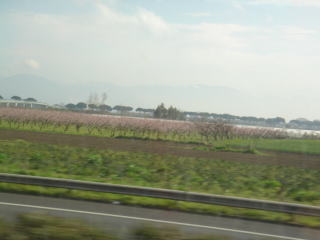 途中の道は丁度日本の春と同じ、桃の花と菜の花の色の組み合わせが美しい。はるかに見えるのは古代ローマ帝国のアッピア街道。