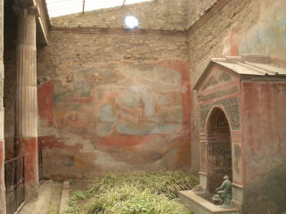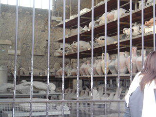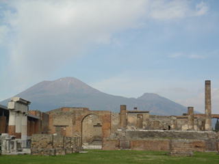ポンペイは好天でも暑くはなく観光には絶好でした。広場から泉、居酒屋、パン屋、娼館、豪邸、浴場などを見物、今と遜色ない文化生活を送っていたらしい昔の人の工夫の数々に感心するばかり。 |
