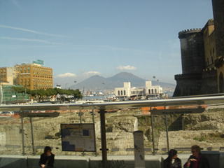 再びナポリへ戻りカプリ島の人たちと合流、青の洞窟にも入れたそうで皆満足そう。ナポリ名物の洗濯物の傍を通り、簡単な市内観光。艦砲射撃の後が残るヌオヴォ城の近くは工事中、覗いてみたらやはりというか、またまた古代ローマの遺跡が出てきて苦戦している様子だ。駐車場を作ろうにも地下鉄を作ろうにも、掘れば必ず出て来てしまう遺跡に都市整備は遅々として進まないのだそうな。