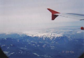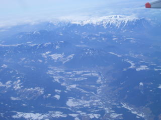 飛び立った飛行機からはローマ近郊の海岸線がはっきり、海上の潮目までが見える。やがて欧州本土へかかると、オーストリーまでは雪を被った山々、アルプスだ。 |