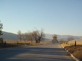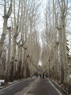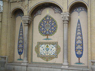 バルコニーの付いた宮殿、前に池があって、その先が緑、というのがガジャールの特徴的な建築洋式とか。宮殿の正面にはイランの歴史・伝説に基づいたタイル画が見える。 ここは糸杉も有名で素晴らしい並木道がある。その先の山の上にはシラーズ大学が遠望できる。 |