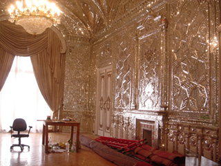 宮殿の敷地内には沢山の建物が建っているが、まずは緑の宮殿と呼ばれるパーレビー王朝時代の建物へ。内部は一面の鏡モザイク張り、細かく切ったガラスが貼り付けてあって、輝いて見える。これはペルシャの得意技らしく、この後で行った色々なところで使われていた。