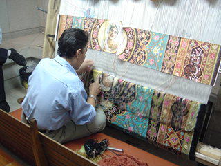 次は絨毯博物館。通常中近東で絨毯屋と言うと「押し売り」が相場だが、絨毯博物館というここは商売無し。外観は織機(はたおりき)の枠をイメージした造り、入り口のホールで織っているところが見られ、内部は様々なペルシャ絨毯の展示。同じペルシャ絨毯でも地方色があるということで、作成された場所、品質の決め手である細かさ、時代などが解説されている。幾何学模様は遊牧民に特有のものだと言う。