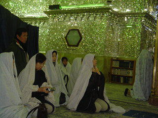 ハムゼという人は9世紀の聖人。 門を入ると石が敷き詰めてあるが、殆どが墓石。それを踏んで建物に入る。 カーテンのような大きな布を持ったオバサンが待っていて、女性はそれを被る。よく洗濯してあるらしく、ちょっと色褪せた細かい模様の普通の布。 外壁は地味な感じのモザイクタイルのモスクだが、入ってみると内部は鏡モザイクで埋め尽くされていて壮観。 |
