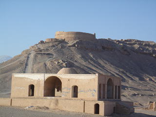 ←最初は「揺れるミナレットの塔」ミナール・ジョンバン。700年前モンゴル支配時代の建物で、片方の塔を揺らすともう一方の塔も同時に揺れるということで有名。 毎正時に係員が右側の塔に登り揺らす。反対側の塔には鐘が付いていて、なるほど目で見ても分かるほどの揺れで鐘がなる。ちょっと不思議。 →そのすぐ先には丘の上にササン朝時代の拝火教神殿跡。日干し煉瓦が崩れて殆ど廃墟だが、沢山の人が登っていた。 |