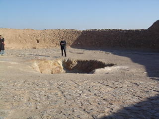 砂漠の中に銀色に光るモスク、昼食は絨毯の産地として有名なナイン。ここではヤズド焼の食器が出た。 食事の後はまたまた砂漠の中を走行、途中にはバルアバードというサファービ朝時代のキャラバンサライ、旅する商人隊が泊まった場所だ。 現在は使われていないので廃墟だが、昔の商人の中にはお宝を埋めて隠した人もあったということで、エジプトと同じく盗掘の跡があった。 幹線路に沿った立地を活かして近年、宿やレストランにしようという計画が持ち上がっているとのこと。屋上に上ると行き交うトラックのかなたに険しい山々が霞んで見える。 |