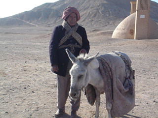 | 山の上からは遠くにヤズドの町が見える。 降りていくと「ガナート」と呼ばれる貯水施設がある。 人が立っているのは入り口で、奥に見える円錐形のが貯水槽のカバー、両側に立っているのは空気抜きの煙突で「風の塔」と呼ばれ、ヤズド市内にも沢山見られた。 砂漠の真ん中の町なのでガナートは非常に大事、そして水が蒸れないように空気抜きも大切ということだ。 さて帰ろうかという頃、墓地域の鍵を持っていたオジサンがロバを連れて近づいて来た。 一緒に写真を撮るため。有料。 |