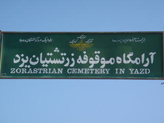 次はゾロアスター寺院。正面のシンボルは様々なことを表している。一番下の三段の羽根は良い行い、良い話、良い考えというゾロアスター教の3つの教え、黄色い大きな輪は輪廻、小さな輪は神との約束、尻尾は悪い行い等々。