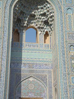 次はマスジェデ・イマームという大きなモスクと神学校。このイマーム広場の中心となるモスク。ゾロアスター教の名残として入り口中央に巨大な「水鉢」が置かれている。内部は近日中に行われる大集会の準備中で巨大なテント張りが作業中。 |