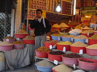 中心地へ戻ってイスファファンで一番古いジャーメモスクへ。入り口付近はバザールになっていて、初めてここで、女性達が羽織っている長着を売っている店を見た。同じように見えるが、黒地に模様が入っていたり、透けていたりレース状だったり、藍染のような模様の入った薄色もあり、とてもおしゃれ。内側には真っ赤な服などを着ている人もあり、一概に「抑圧された女性」という表現は当らないと感じた。中東らしい香辛料店もバザール内には一杯。