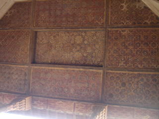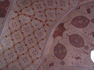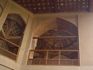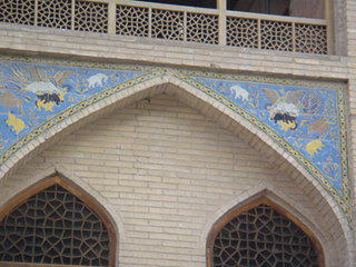 次は17世紀後半サファービ朝時代に建てられた宮殿ハシュト・ベヘシュト。 八天宮という意味の宮殿は現在は木立に囲まれた公園になっているが昔のハーレムで、美しく彩色された部屋が沢山ある。 外部は動物を模ったタイルで飾られている。 |