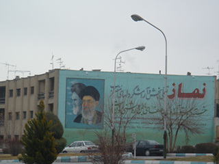 川の上流には水鳥がいっぱい。茶色の乾燥したイメージが強いイランだが、豊かな水量は人の心にも大いに潤いを与えているようだ。 反対側の広場にはホメイニ師とハメネイ師の大きな肖像画。イランに来て不思議に思ったのは、偶像崇拝禁止で侵入した国々では像の顔を破壊し続けたイスラムの国なのに、至る所にこの二人の肖像画掲げられていること。他の人の写真などもあちこちにあった。 宗旨変えしたのか。 |