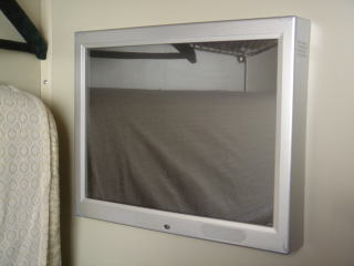 ベッドの上には日本の普通の厚ぼったい掛け布団が置いてありました。がさばって邪魔、上段のベッドは昼間もたたまないので、布団置き場になりました。梯子が付いていなくて、小さな足置きで弾みをつけて登るので、二階ベッドは結構大変でした。カーテンも無いので着替えが丸見え。スリッパはついていました。 窓際の小さなテーブルにはポットに入ったお湯が置いてありましたが、お茶やコーヒーなどの食材は無し、コップも必要です。 また、何が映るのか壁掛けテレビがありました。 |