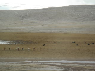 | 窓の外はとても寒く、ほとんど雪景色でしたが、こんな中に野生の動物が沢山見られ、小さな華奢な動物が雪の地面に座っているのを見たのには驚きました。 ラサに近づくと野生ではない、飼われているヤクや羊も見られるようになりましたが、「飼っている」のと「野生」も違いは何か、よく判りません。 大雪原の中にはポツンと一軒家が建っていたり、トラックが一台で走っているのなどが見えました。事故の時にはどうするのか心配になりましたが、この鉄道が出来るまではバスがあのように走っていたんだそうです。 |