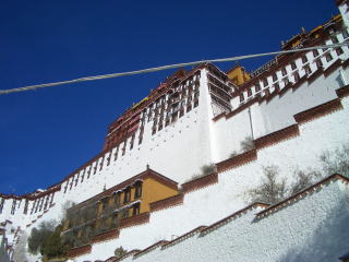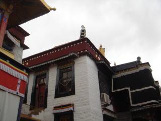 何度も読み返した「Seven Years in Tibet」に出てくるダライラマの勉強部屋なども見学しましたが、暗くて狭いので驚きました。「活き仏」と認定されたために辿らなければならなくなった、この狭く、重苦しく、暗く、暑く、空気の薄い部屋での友達も無い勉強生活、遊んでいるのが見えると気の毒なので、みながポタラ宮殿から見えないように遊んだということですが、「Seven Years in Tibet」の著者ハラーとの交流が、どれほどの息抜きになったか思いやられます。そして全チベット人民とチベット仏教を背負った現在の亡命生活、王子に生まれたわけでもないのに、何という波乱の人生でしょう。 白宮殿を出ると一度屋上のようなところに出ます。ポタラ宮殿の建物の屋根はほとんど黄金で覆われています。それらを見てから紅宮殿へ。そこには歴代のダライラマ廟があります。それにしても、チベットはあんなに沢山の黄金や宝石をどうやって手に入れたのでしょう、歴代ダライラマの廟はそれぞれ数百キロの黄金と大量の宝石で飾られていました。 |