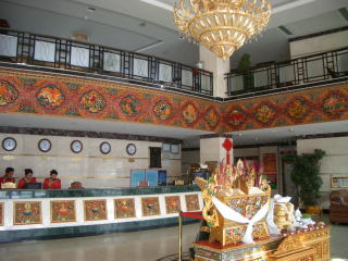 高山病で午前中の観光をパスした人と合流のため、一度ホテルへ帰りました。私達が泊まったホテルは新しい清潔、近代的なホテルでしたが、民族色を強調して、ポーターさんはチベット風の衣装を着ていました。またロビーにはお正月の飾りが美しくしつらえてありました。 このホテルには診療所があり、高山病で苦しくなった人たちは簡単な診察後に「高原康」という薬を貰いました。 苦しい時には3錠、予防には1錠ということで、私もこの翌日には飲みました。効いたかどうかは定かではありません。 |