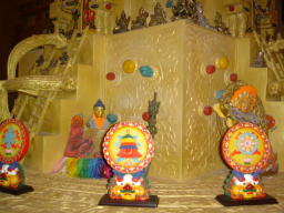 大経堂、ツォンカバ師の生地などを通った後に、有名なバター彫刻がありました。触ることは出来ませんが、硬いのでしょね、彫刻できるなんて。新年には取り替えるということで、年末のこの日には全体が下向きになって鮮やかな色彩もホコリ一杯という、少々しょぼい様子でした。