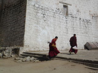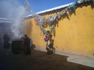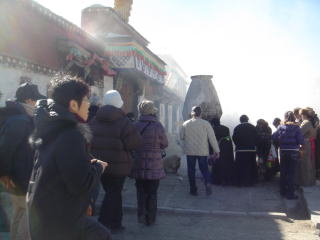 山を降りて次はチベット最古の寺の一つと言われるタントゥク寺。新年なので初参りの人でごった返していましたが、そんな喧騒の中、羊が一頭・・・迷い羊でしょうか。寺の入り口には線香を置く大きな陶器の容器があり、煙でむせ返りそうでした。そういえばラサのジョカン寺の前にもありました。私達が供える線香とは桁違いのダイナミックさ。 中も人が一杯でした。文化大革命で破壊されたのを修理中ということですが、ポタラ宮殿を開放的にした感じでした。 |