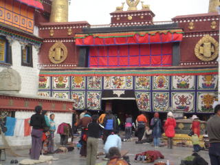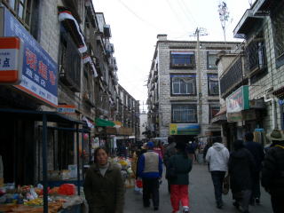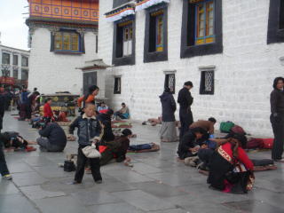 次はジョカン寺。横浜の中華街のような商店街の間を通って行きますが、売っているものがコワイ、生肉を露店で・・・。 明日がチベットでは大晦日ということでジョカン寺の中には入れませんでした。寺の前では大勢の人が五体投地、専用の布団のようなものを敷いて、手には下駄のようなものを履いて、ダイナミックにやっていました。 ジョカン寺を囲む商店街外・八角街は凄い人出でした。寺を囲んで時計回りの道には大小の店がひしめいていて、ラサの土産も沢山売っていました。値段は同じものでも様々。 ↓生肉を売る露店 |