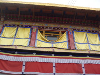 ポタラ宮殿は高いので、バスで移動する際には、いつも見えていました。また、車中からはチベットの典型的な家として殆どが窓という感じの家々も紹介されましたが、随分近代的でした。最近のものでしょう。 セラ寺はチベット仏教の大僧院で、日本の河口慧海や多田等観も滞在した所ですが、年末のこの日は大半の坊さんが帰郷しているらしく、閑散としていました。 大集会堂の前にはチベット独特の色鮮やかな幟が建っていました。 |