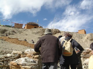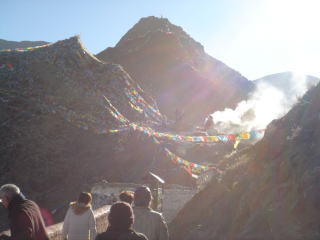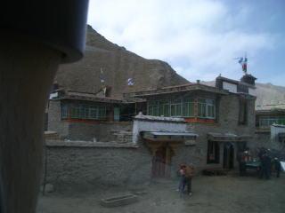 終日「王家の谷」と称されるチベット発祥の地を観光。まずは2世紀の王宮ユンブ・ラカンへ。高地の更に高地、こんな場所に王宮を定めたのはどんな酔狂な王様だったのでしょう。見上げただけでも勇気が失せそうな急勾配にはちゃんとお馬ちゃんが待ち構えていて、乗って登山した人もいました。私はテク。 登りきった所には天井が高い見張り小屋のようなお堂のような建物があって、中にラマ僧が数人いました。チベット初代王の宮殿を1982年に復元したものとのことです。お経をあげているようでしたが、何だか山小屋で囲炉裏を囲んでいる山男、という感じ、ちょっと色が黒いけれど、日本人にとても良く似ていると、このとき改めて感じました。外にはチベット独特の経文を書いた五色の旗が強風にはためいていました。なかなか神秘的。 |