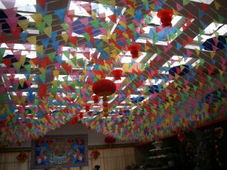 今日は新年なのでレストランも綺麗に飾り立てられています。 夕食は宮廷料理とかで、何とヤクの肉。ヤクの本物の頭蓋骨がお皿の真ん中に乗っていてギョ〜ッ!肉は硬くて「私には」あんまりおいしくはありませんでした。 |