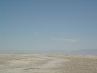 6月27日(水) ツアーバスの参加者との合流は夕方なので、タクシーで塩の湖へ。暑いので水は殆ど涸れて腐敗臭が凄い。ここ独特という細かい無数のハエが煩い。 ←塩の湖 写真撮影中も 無数のハエ→ |