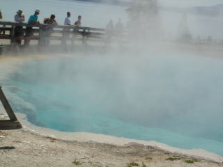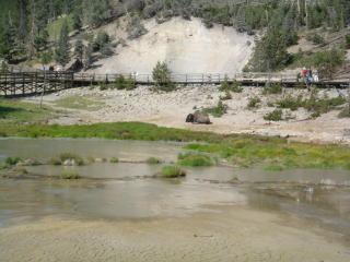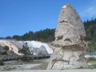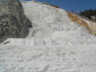 イエローストーン最後の観光場所はマンモスホットスプリングテラス。今まで見てきた全ての場所のダイジェストのようなもの。トルコと同じような石灰棚があるが、水が涸れ、古いのはとても汚い。観光客の来過ぎ?