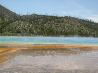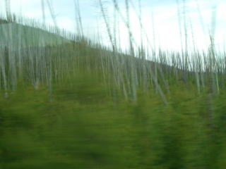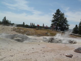 一度公園を出て、ウェストイエローストーンの町へ。イエローストーンとは噴出する硫黄で黄色く染まった岩にちなんでつけられた地名、途中には硫黄で枯れた木々や、何年も前の大火の燃え残りの木々、その間にノンビリ草を食む野生動物などが見られる。