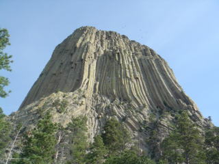 まずはデビルズタワー Devils Tower。まっ平らな平原に突如溶岩が吹き出て出来た奇観で、遠くからも良く見える。