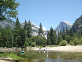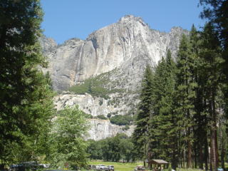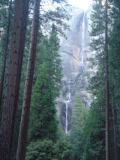 ![]() 左二つ:ヨセミテ滝 上:ハーフドーム。氷河の移動によって、スッパリ削られたそうな |